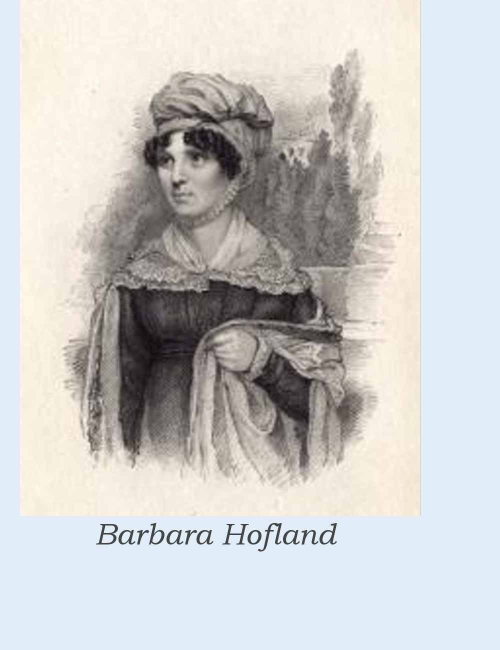 Born Barbara Wreaks or Wreakes, her father Robert Wreakes was a Sheffield manufacturer who died when she was three. She was raised by a maiden aunt in Dinnington where she was briefly educated at the village’s dame school. She began writing for the local paper and started a milliner’s shop, but she sold it when she married the businessman Thomas Bradshawe Hoole in 1796. She was widowed two years later with an infant son. She went to live with her mother-in-law in Attercliffe and supported herself partly from generous subscriptions given for a book of her poetry. Then in 1809 she opened a girls’ boarding school at Grove House, Harrogate, and developed it as a ladies’ finishing school, a forerunner to what is now Harrogate College, but she kept it only until 1811 when she moved to London. In 1810 she married the landscape artist Thomas Christopher Hofland (1777–1843). Although her new husband had a good local reputation and had exhibited at the Royal Academy, his wife’s writings were to remain the main source of family income thoughout their marriage.
